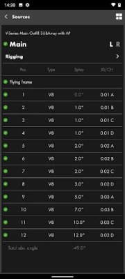 The ArrayCalc Viewer app provides data such as splay angle, amplifier channel ID and cabling information, flying frame height and the height of the lowest edge, frame angle, horizontal aiming, Pickpoints, weight and load status. Any change to the system design can be distributed to each user immediately, ensuring an efficient and user friendly approach to rigging.