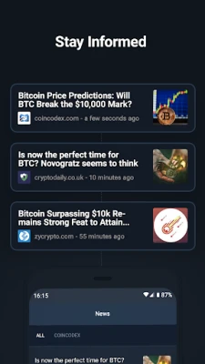 Receive notifications with the most important updates from the cryptocurrency market. Stay on top of Bitcoin price changes, the performance of your portfolio, and the biggest daily gainers and losers.