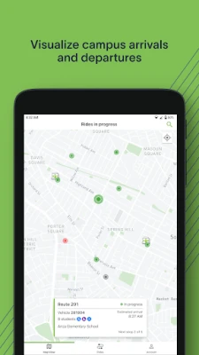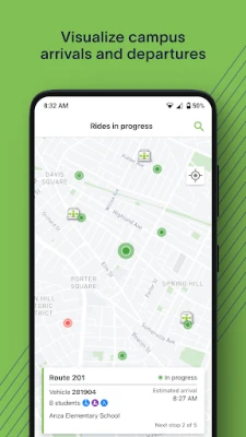 REAL-TIME LOCATION OF VEHICLES View the current location of vehicles en route to your campus via a convenient map. Easily identify vehicles that have arrived or have potential delays so that student arrivals and dismissals can be safely managed.