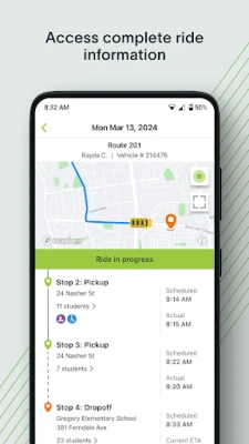 COMPLETE RIDE INFORMATION Access student and vehicle information for each ride, including a detailed stop-by-stop view of students who have been picked up or dropped off, along with pick up and drop off times.